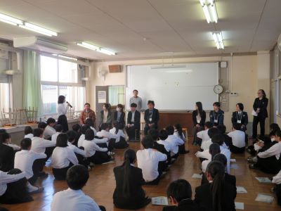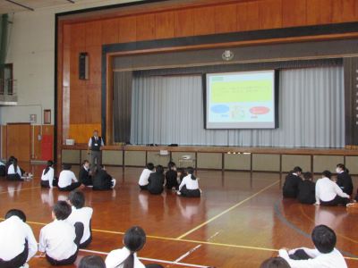 11月6日(木)5・6限目、地元で働く方々を講師に迎え、「働くことの厳しさや喜びなどについて」のお話を聞かせていただきました。2年生の進路学習の一環として行われたので、今後の進路選択に役立ててほしいと思います。