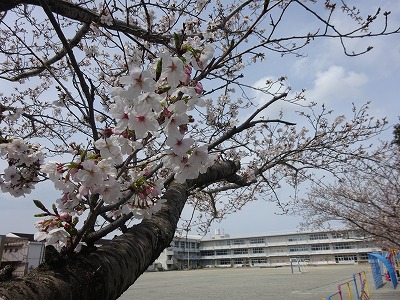 市内の桜は見頃を迎えていますが、校庭の桜はまだ五分咲きといったところです。