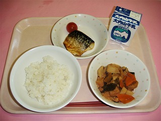 むぎごはん牛乳さばのしおやきミニトマトみそにこみ