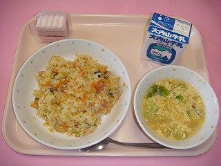えびチャーハン牛乳たまごとはくさいのスープおこめdeクリスマスいちごケーキ