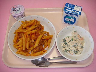 ペンネアラビアータ牛乳だいこんサラダプルーンヨーグルト