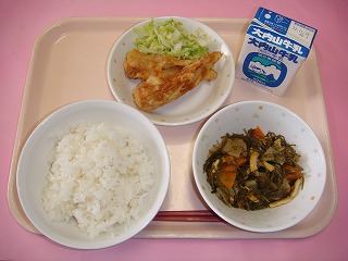 むぎごはん牛乳ちくわのこうようあげごまキャベツこんぶのいなかに