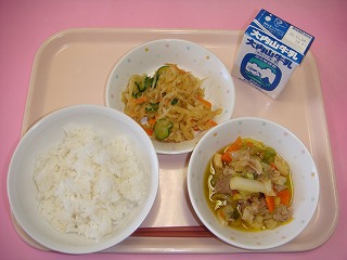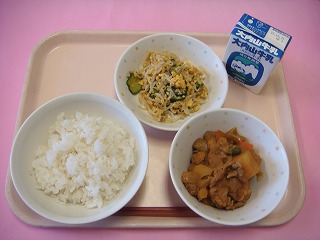むぎごはん牛乳ぶたにくとじゃがいものみそいためもやしのごまずあえ