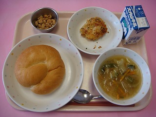 こめこいりまるがたパン牛乳チキンのかわりカツレツオニオンスープふくふくまめ