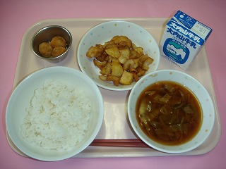 むぎごはん牛乳とりにくとちくわといものあげにみそしるきなこだんご