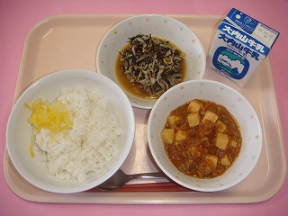 むぎごはん牛乳マーボーどうふあらめいりナムルたくあん