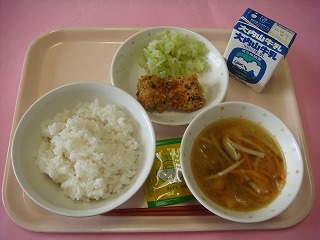 むぎごはん牛乳いかのひじきフライそえキャベツすましじるやさいふりかけ