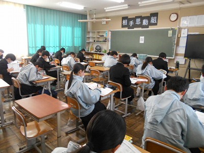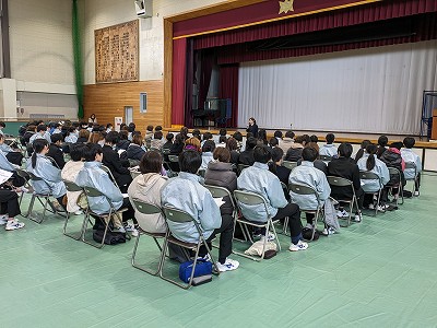 現在、1・2年生は学年末テストの真っ最中です。一足先に学年末を終えた(まだ後期選抜が残っていますが)3年生は、学年レクを午後を利用して行いました。短い時間でしたが、長い人は保育園から、または小学校から一緒に過ごしてきたみんなとも、いよいよバラバラになる時が迫ってきました。名残り惜しいですが、残された時間を有意義にすごしてもらいたいです。