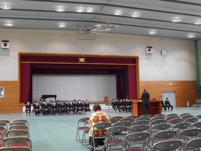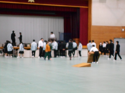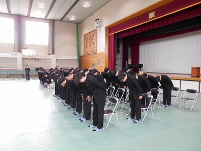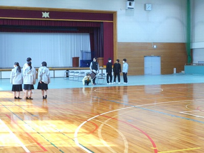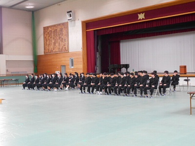 2年生が設営してくれた会場を使って、3年生の式練習も本格的に始まりました。山本先生の「一部の人がきちんとしていないとそれがものすごく目立ち、ひいてはそのようなゆるんだ雰囲気の学年である…と思われる」という言葉はまさにその通りです。自分一人の行動が、学年全体の評価につながるというものなのです。一同礼はだいぶそろっていましたよ!