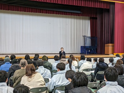 7日(土)には新入生説明会が行われ、その会場のまま9日(月)に2年生対象に修学旅行・進路説明会が行われました。体育館という非常に寒い会場でしたが、多くの保護者の方々にご参加いただき、誠にありがとうございました。最初のあいさつでも話しましたが、ついこの間入学式を行った学年が、もう進路についてなんて…時のたつのは本当に早いものです。