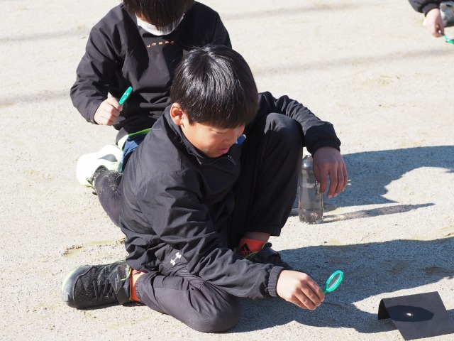 虫眼鏡を使って太陽の光を集めました(3年生)。