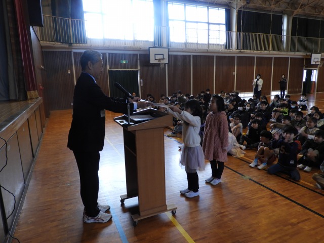 終業式後は、各担任から通知表を渡しました。お子さま自身が2学期の生活や学習を振り返り、自分のよさや可能性、成長の様子を自覚できるよう話をお願いします。そして、さらに「やる気」や「希望」を持ち、「自ら学ぼうという意欲」が持てるよう、ほめて、励ますよう通知表をご活用ください。よろしくお願いします。
