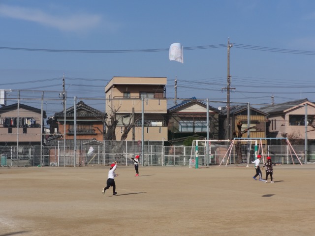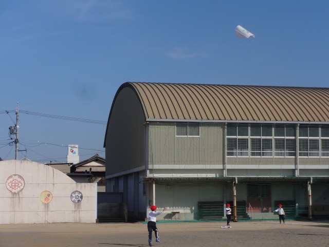1年生が生活科で作ったたこをあげました。風を受けて高く高くあがりました。友だちのタコ糸とからんでしまって大変でしたが、たこあげを楽しんだ1年生でした。