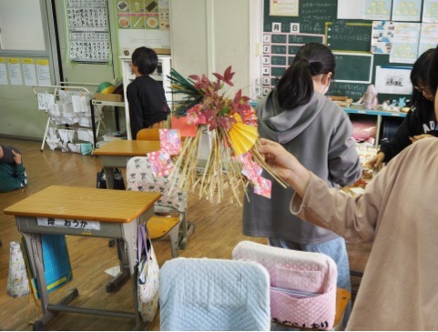 今日は図工の時間にお正月飾りを作りました。稲わらを編み込んでしめ縄を作ったり、南天の実や葉を使って正月飾りに仕立てたりしました。手作りの正月飾りで迎えるお正月。来年もいい一年になりますように。