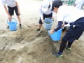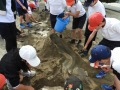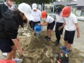 まずはグループごとに山作りから始めました。どのグループもりっぱな山を完成させました。完成した山に川を作り、いよいよ頂上から水を流します。すると、「わぁ!」という声とともに上流では激しい侵食が、中流のカーブでは外側の侵食が激しく内側は堆積し、下流では川幅が一気に広がり水の流れで運ばれた土砂が堆積していく様子を観察することができました。砂場での実験ではありましたが、子どもたちは自然が作り出す地形が創り上げる原理を肌で感じることができました。