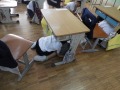写真は左から、机の下に隠れる様子、運動場へ避難し整列する様子です。