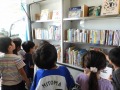 写真は左から移動図書館の車、読み聞かせを聞く子どもたち、本を選ぶ子どもたち(ともに1年生)です。