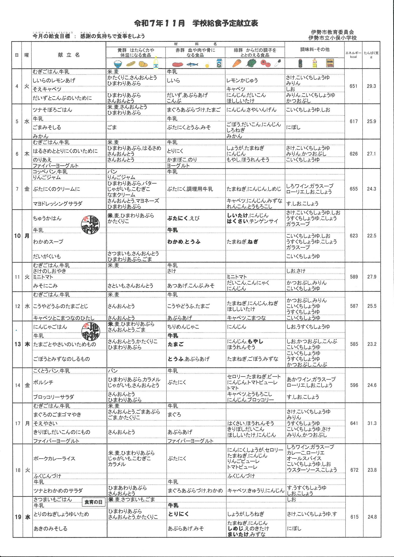 11月4日から19日までの献立です。
