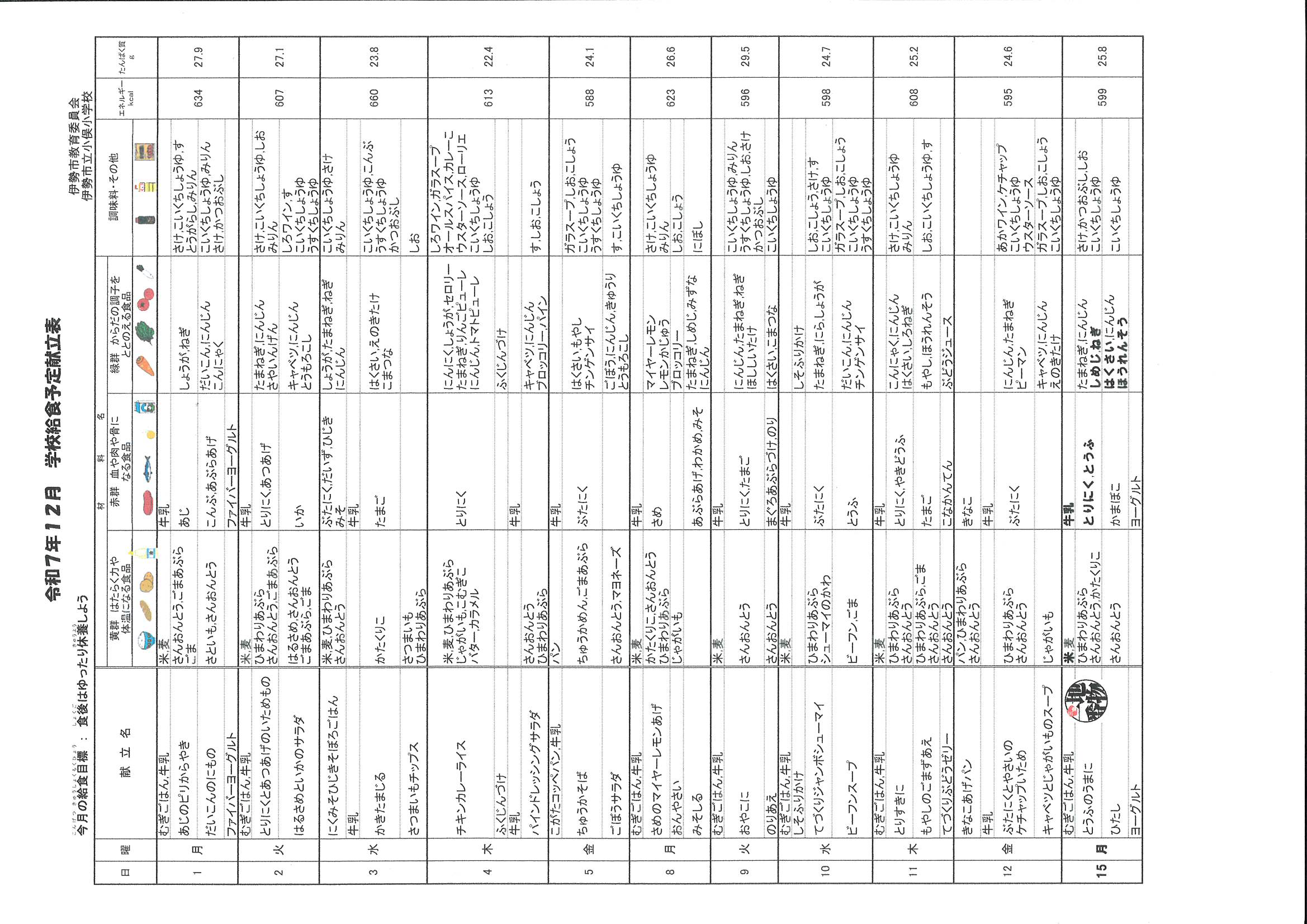 12月1日から15日までの献立です。