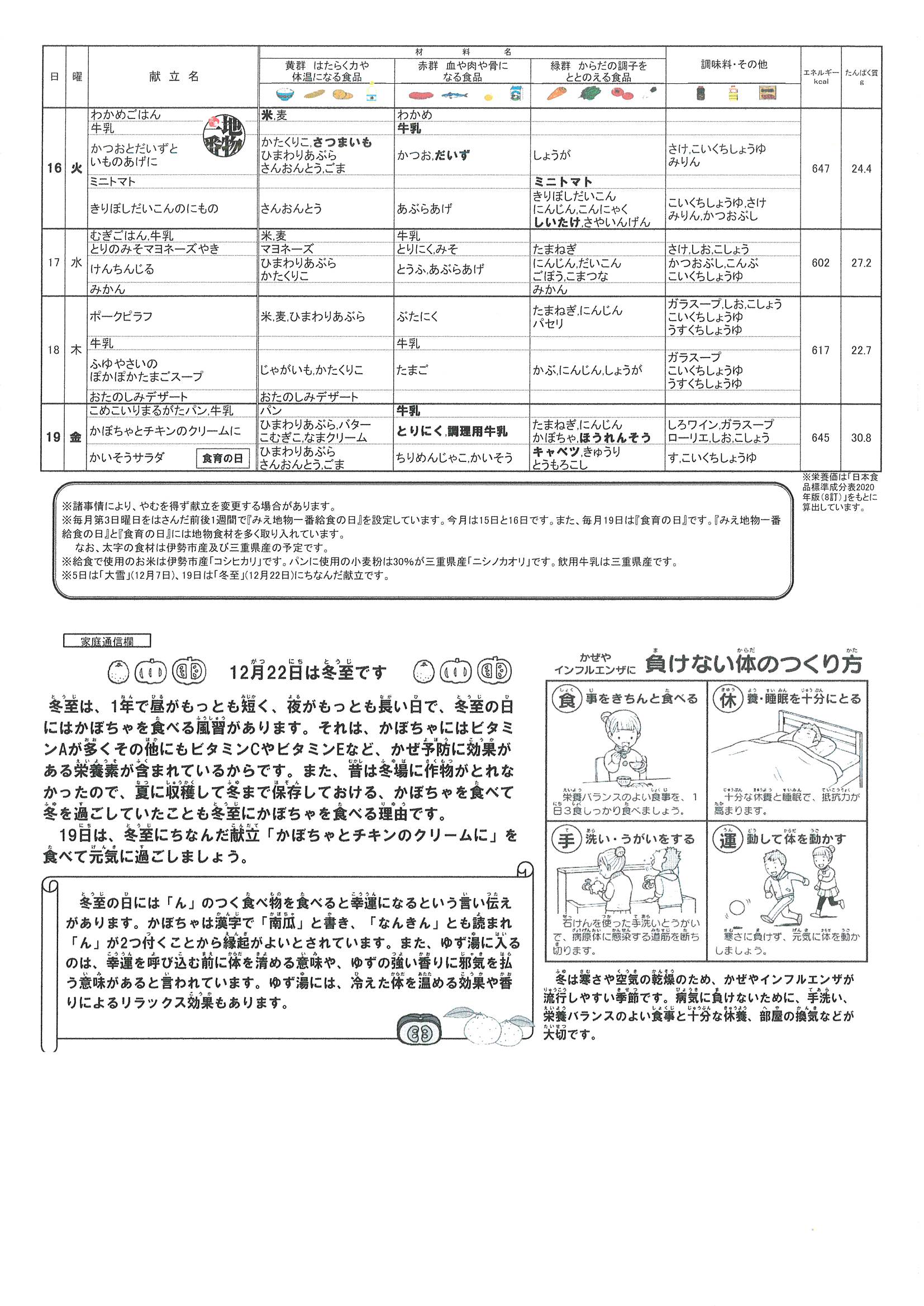 12月16日から19日までの献立です。