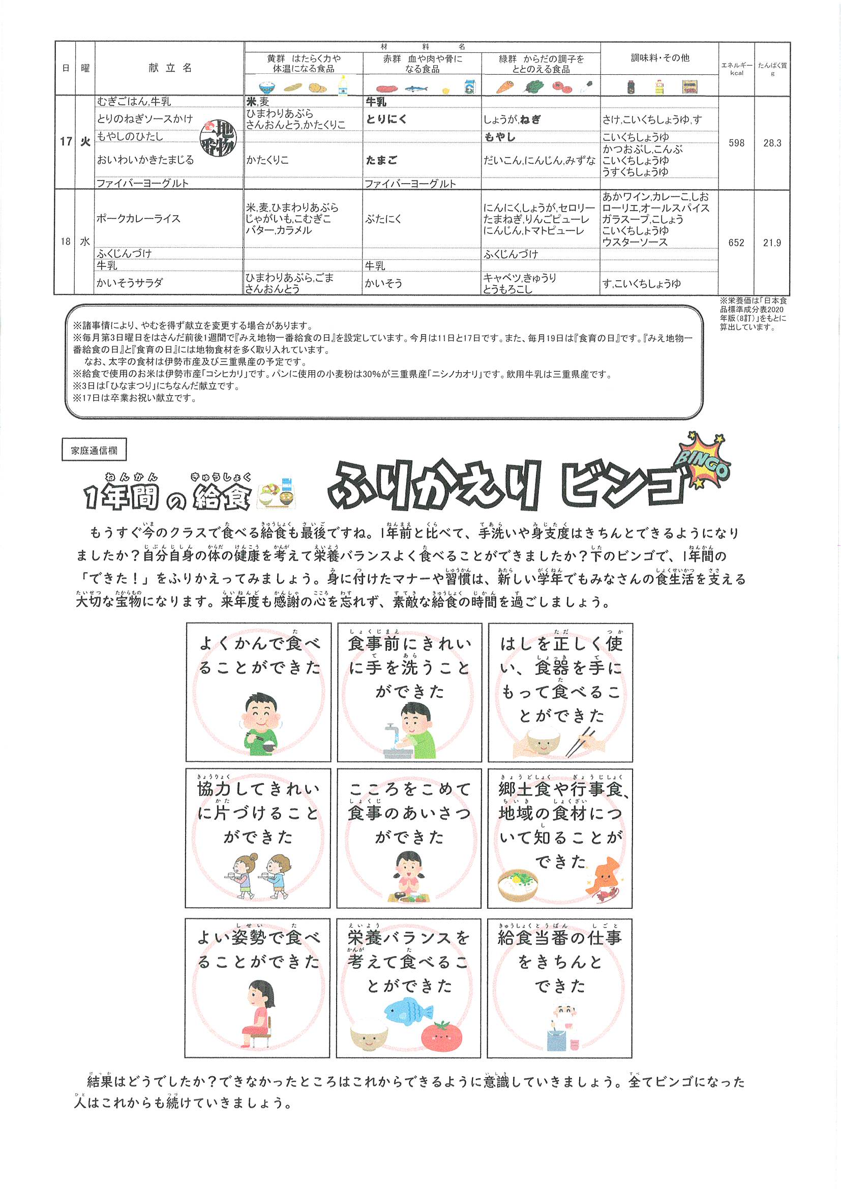 3月17日から18日までに献立表です。