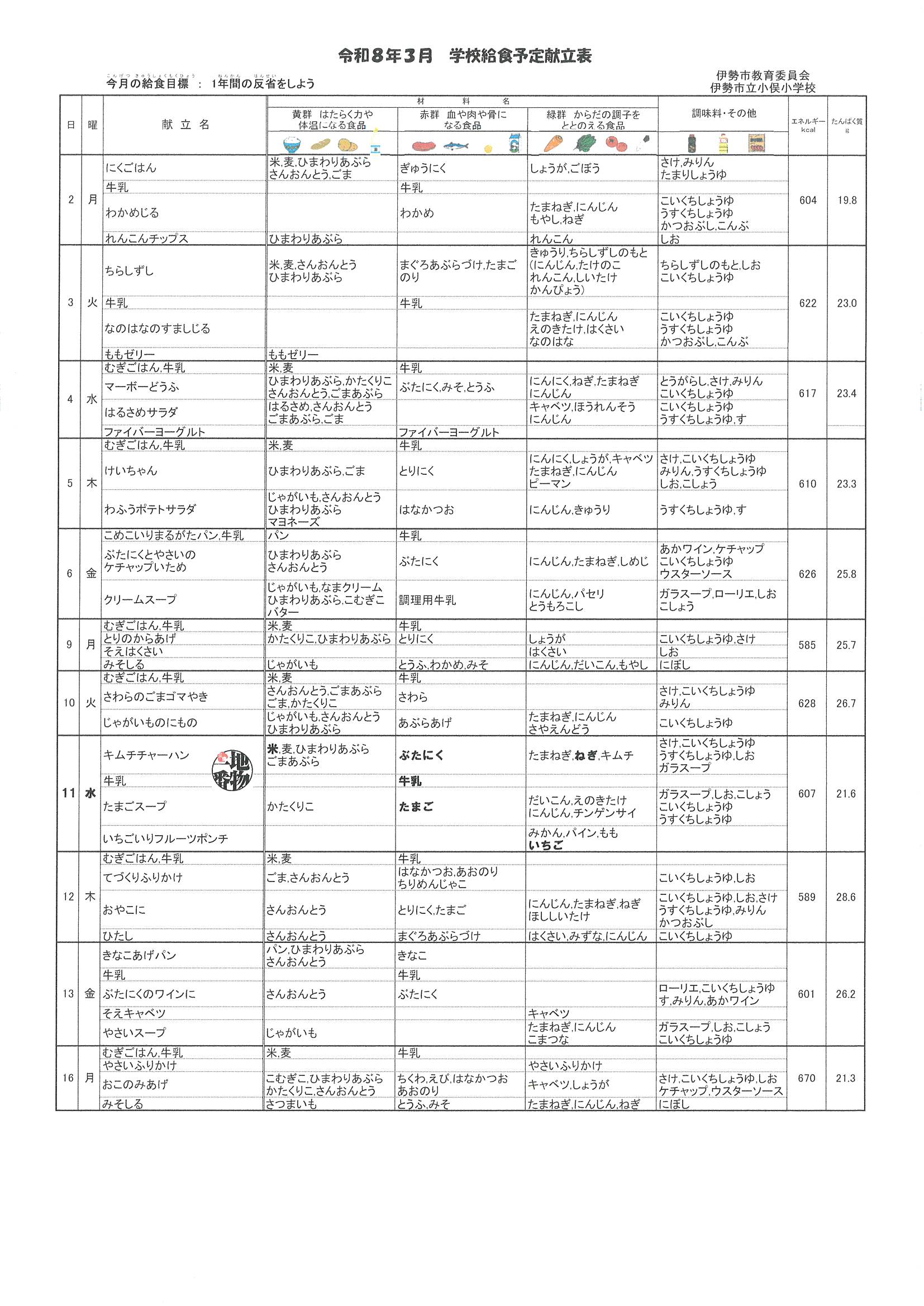 3月2日から16日までの献立表です。
