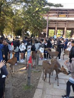 東大寺大仏殿を出て、南大門で金剛力士立像を見学しました。そして、旅行会社さんのご厚意で、一人一枚鹿せんべいをいただき、鹿とふれあいました。貴重な時間になりました。
