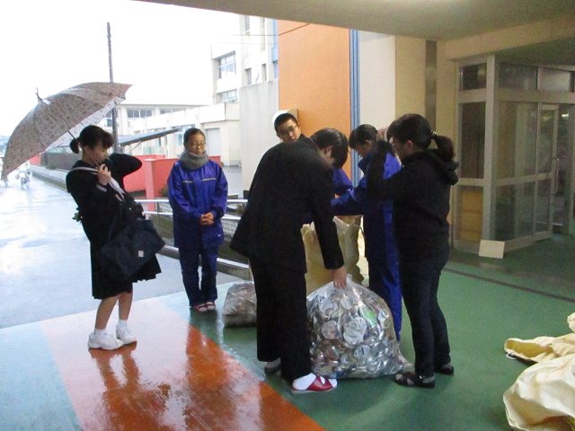 8日(水)の登校時には、爆弾低気圧の影響で嵐のような状況でした。それでも多くの生徒がアルミ缶を持って来てくれました。