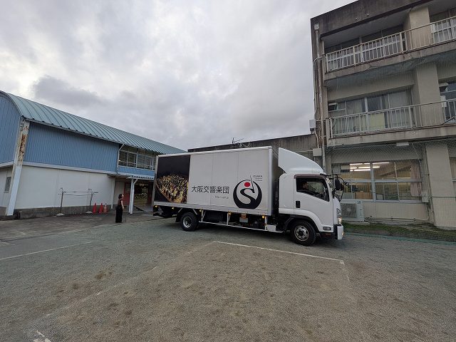 ほどなく、交響楽団のトラックが2台、楽器を運んでやってきました。とてつもなく大きい楽器も搬入してくれています。明日が楽しみです。