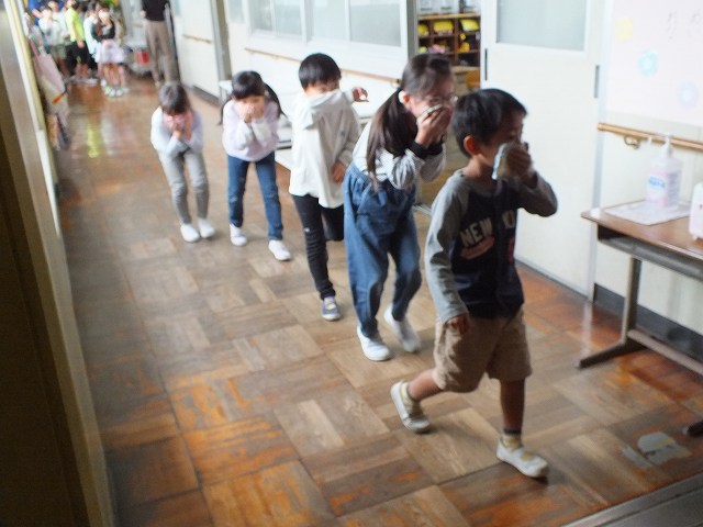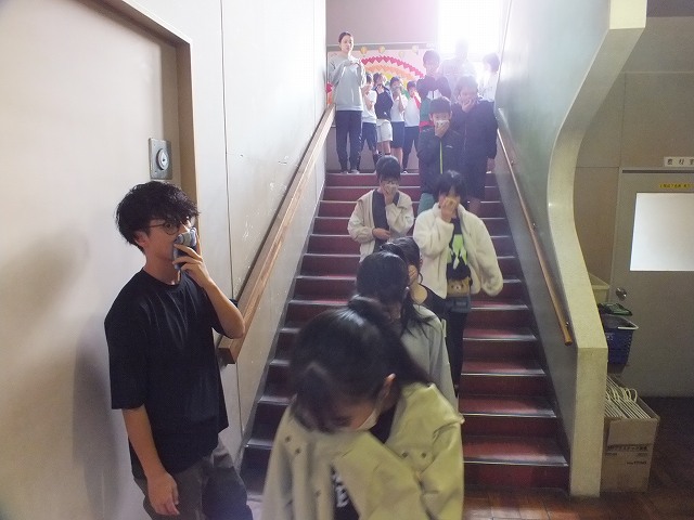 火事が起きた想定で、避難訓練をしました。延焼や煙に注意し、閉まった防火扉をくぐって逃げることを想定しています。