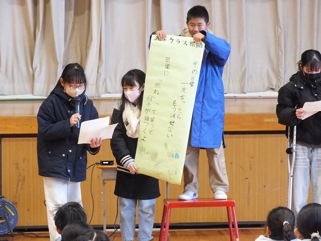 各クラスで話し合い、人権についてのスローガンを作りました。その発表会がありました。