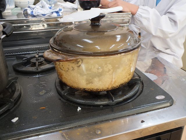 ごはんは、水が沸騰してくるのを見れるようにガラスの器での調理です。しっかりと学習し、おいしくいただけるいい内容でできました。