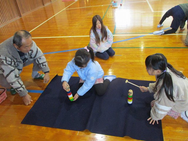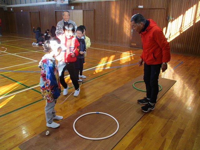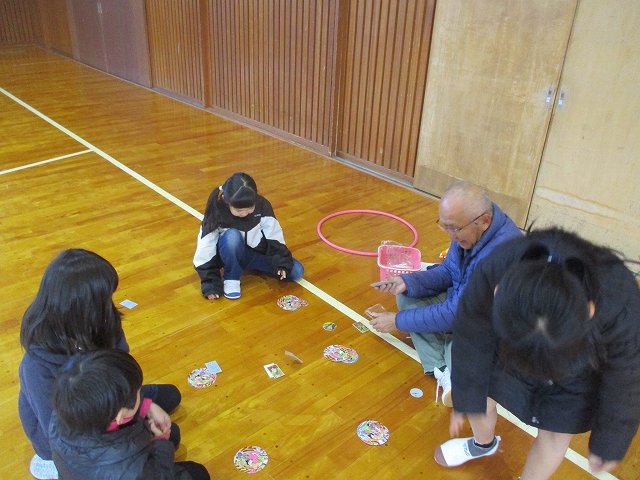1・2年生の生活科「昔からある遊び」をしました。遊びの講師は、四郷地区まちづくり協議会サポーターズの方々です。たいへんお忙し中、子どもたちのために集まってくださいました。