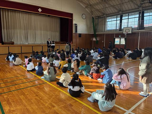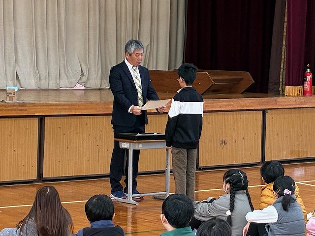 毎月はじめの集会です。集会のはじめに、表彰がありました。夏休みに取り組んだ作品募集の表彰が少しずつ連絡があるため、まとめて集会にて表彰しています。読書感想文や社会科研究、税に関する絵はがきや作文などがありました。