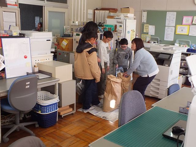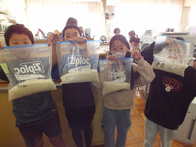 5年生が地域の田を借りて育ててきたお米を配布する日が来ました。玄米でいただいたため、お米レディーズで精米に行きました。学校のすぐ近くにある無人精米機ですが、さすがに30kgを運ぶのは大変だったようです。