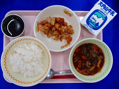 むぎごはん、牛乳、鶏肉と里芋の揚げ煮・かぼちゃと茄子のみそ汁・手づくりぶどうゼリー