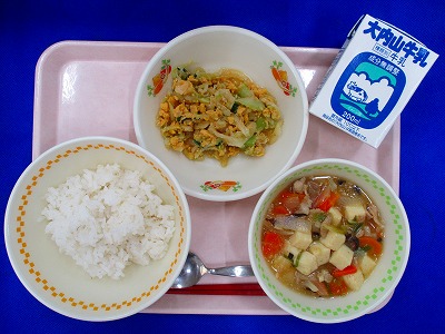 むぎごはん・牛乳・豆腐の中華煮・卵とチンゲンサイのサラダ