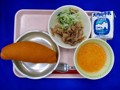 コッペパン、牛乳、豚肉のワイン煮、添え野菜、キャロットスープ