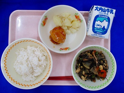 むぎごはん・牛乳・鶏の照り焼き・こふき芋・大豆とひじきの炒め煮