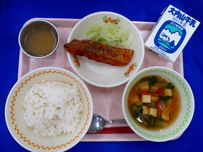 むぎごはん・牛乳・しいらのから揚げ・添えキャベツ・具だくさん汁・手づくりりんごゼリー