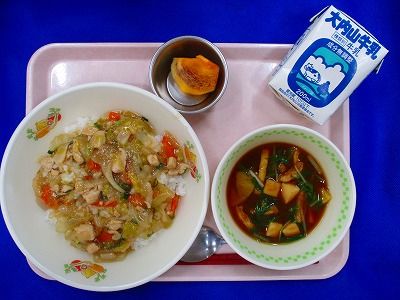 秋のあんかけご飯・牛乳・さつま芋のみそ汁・蓮台寺柿
