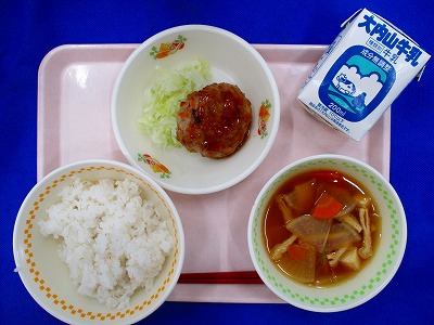 むぎごはん・牛乳・手づくりハンバーグ・添えキャベツ・けんちん汁