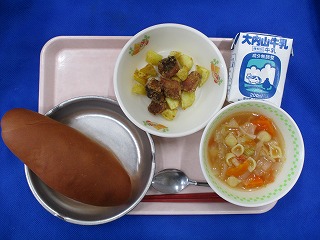 黒糖パン・牛乳・かつおとじゃがいものカレー揚げ・ミネストローネ