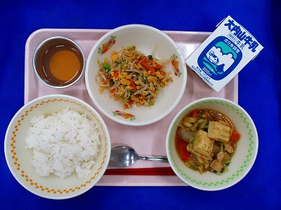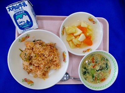 キムチチャーハン・牛乳・ビーフンたまごスープ・りんご入りフルーツポンチ