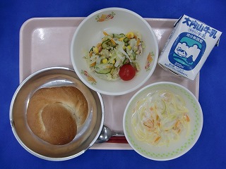 米粉入りまるがたパン・牛乳・スープスパゲティ・りっちゃんのサラダ