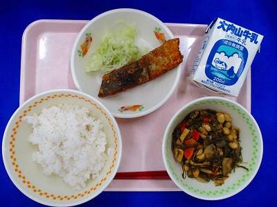 むぎごはん・牛乳・しいらのレモン揚げ・添えキャベツ・大豆と昆布の炒め煮