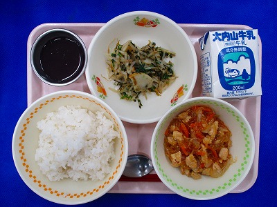 むぎごはん・牛乳・春雨と鶏肉の炒め煮・のり和え・手づくりぶどうゼリー
