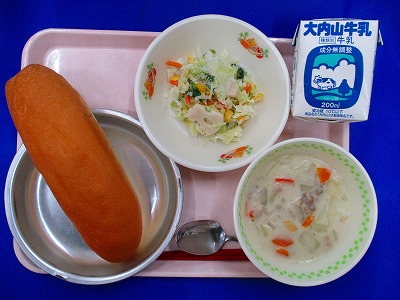 コッペパン・牛乳・豚肉のクリーム煮・マヨドレッシングサラダ