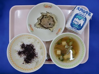むぎごはん・牛乳・しそふりかけ・てづくりジャンボシューマイ・ビーフンスープ