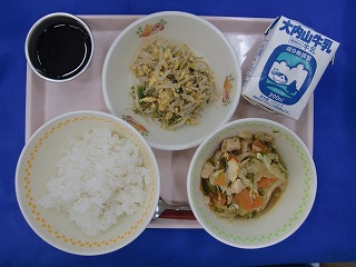 むぎごはん・牛乳・鶏すき煮・もやしのごま酢和え・てづくりぶどうゼリー